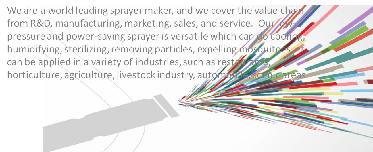 我們是專業的噴霧系統規劃、製造商,我們的產品優勢:省電、無噪音,不論是產品的研發、銷售、規劃都集合了全體工作同仁的用心、團隊合作及全力的投入,