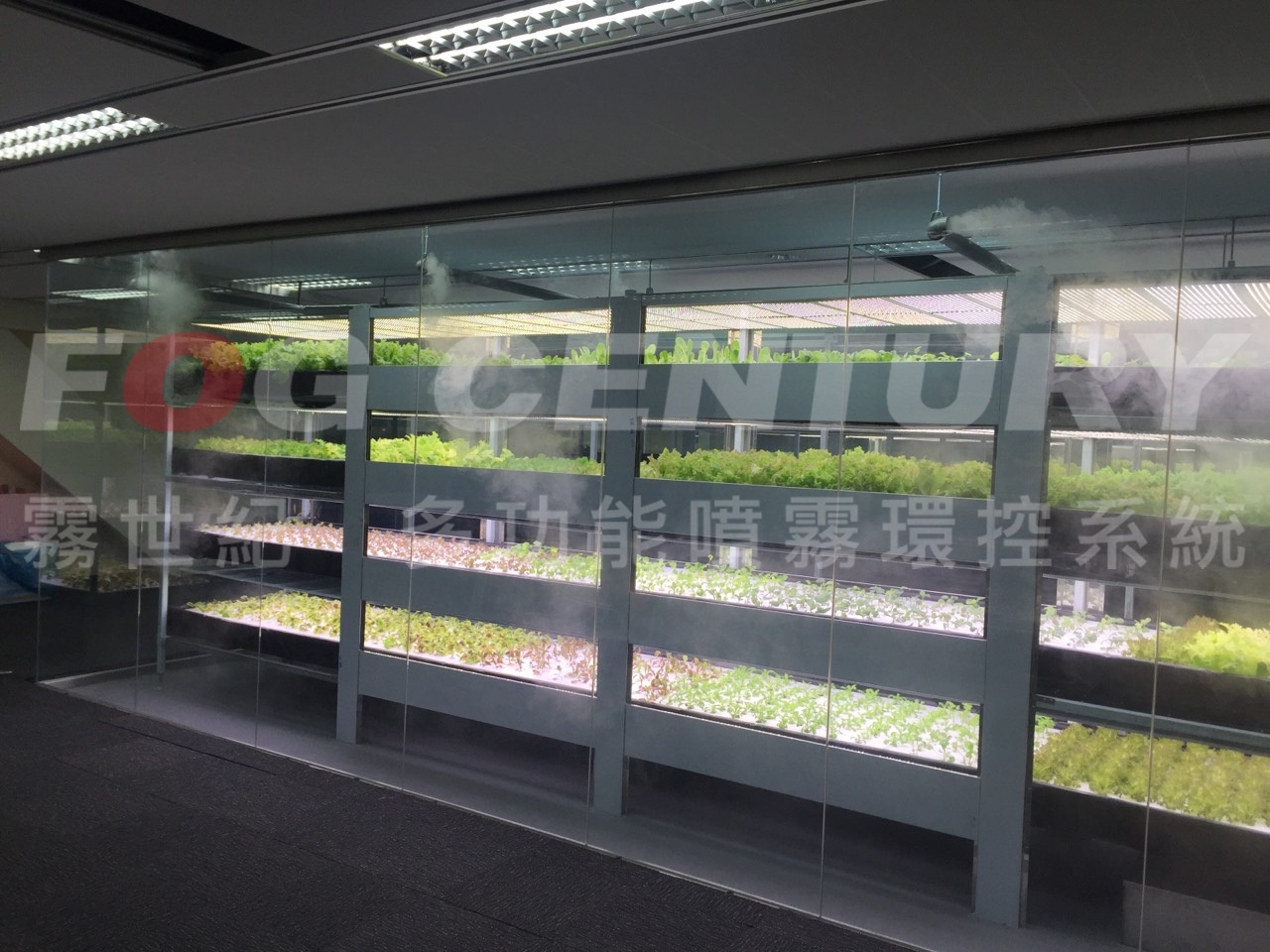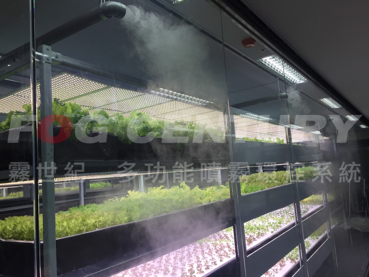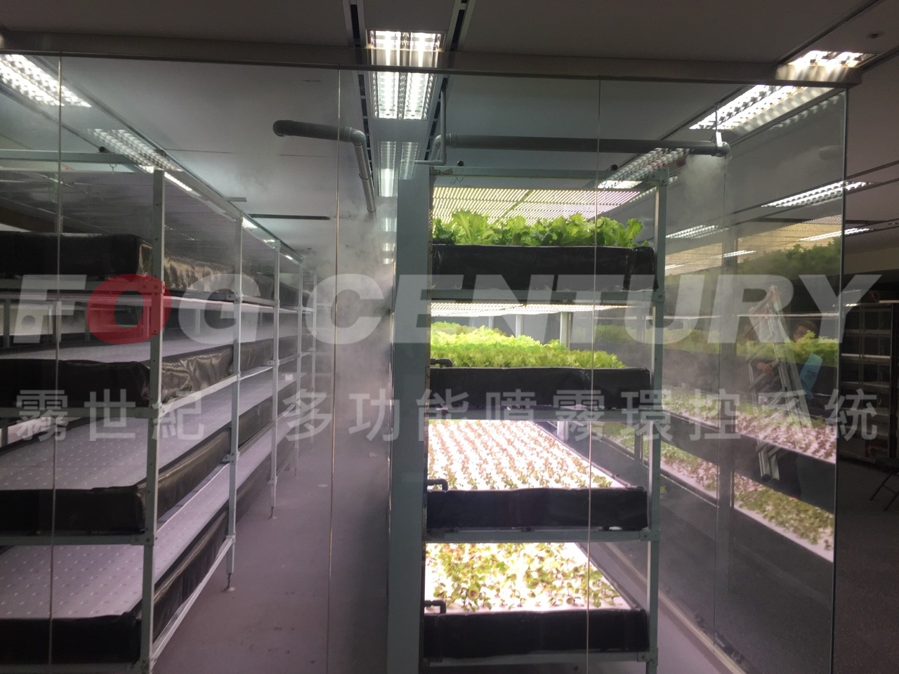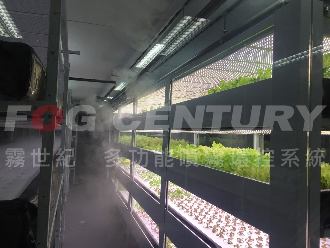 使用超音波工業震盪加濕機為標準配備,以超綿密霧氣達到全廠平均加溼效果而不造成過溼現象,輔佐風機帶動霧氣循環、不著落地面,並加裝溫、溼度自動感測器,當濕度不足時自動開啟噴霧系統,全面環控模擬蔬菜生長所需環境溼度及溫度。
