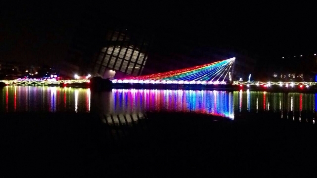 七夕鵲橋定在烏石港舊址,主要配合蘭陽博物館單面山特色,設計成單邊斜張橋的樣式,傾斜方向與博物館相反,呈現對稱的幾何圖形,同時為了維護生態環境,以原有木棧道為基礎,鋪設彩虹燈飾,透過噴霧系統和燈光投射,映照出宛如波光的精緻線條,營造出戀人們漫步喜鵲橋的氣氛。