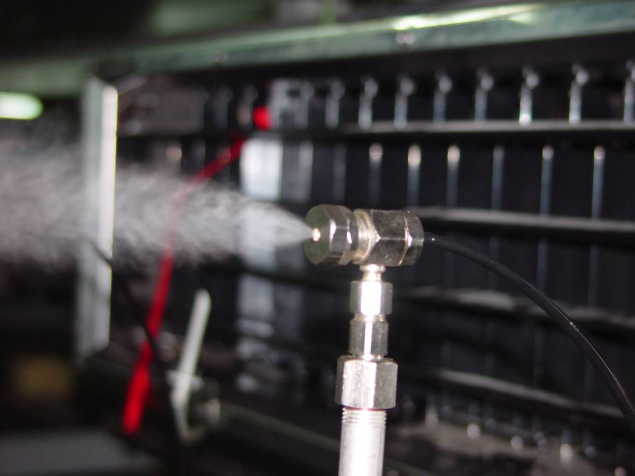 二流體噴嘴的基礎原理 : 透過高速空氣去擊碎液體,使液體粒徑變得更小,造成更小粒徑的液體噴出。
