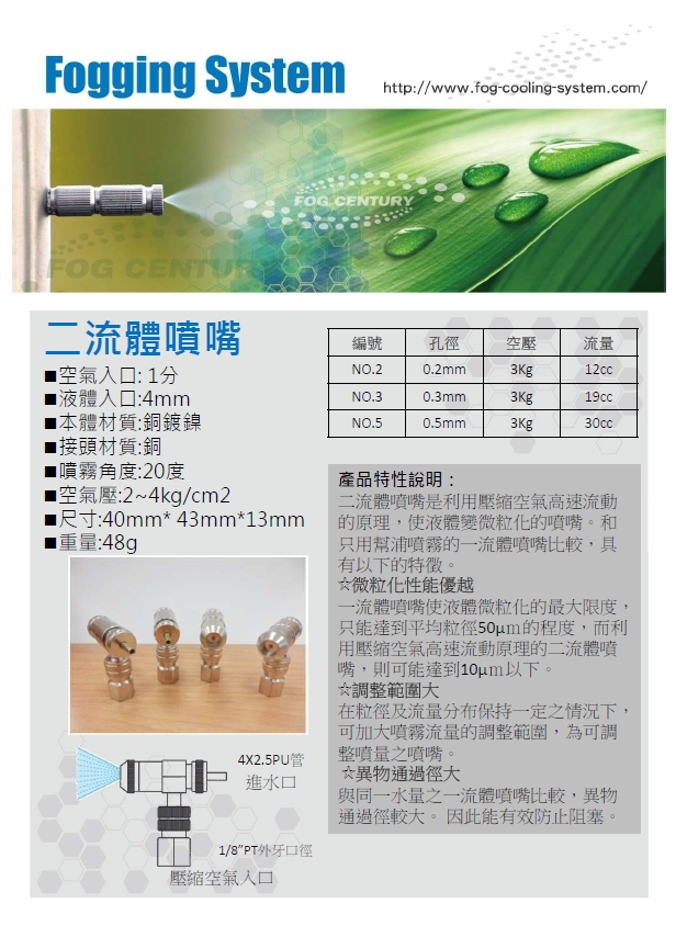 | 編號 | 孔徑 | 空壓 | 流量Min | 霧徑 |